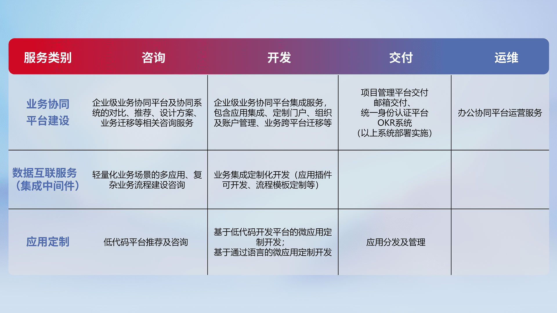 针对钉钉、、、、企微、、IDaas等平台级产品提供产品的规划、、方案、、交付、、、定制化开发等服务,,实现如统一协同办公、、、智能客户服务、、、混合会议管理、、智能数据查询、、、等业务场景,,实现数字化转型。。。。